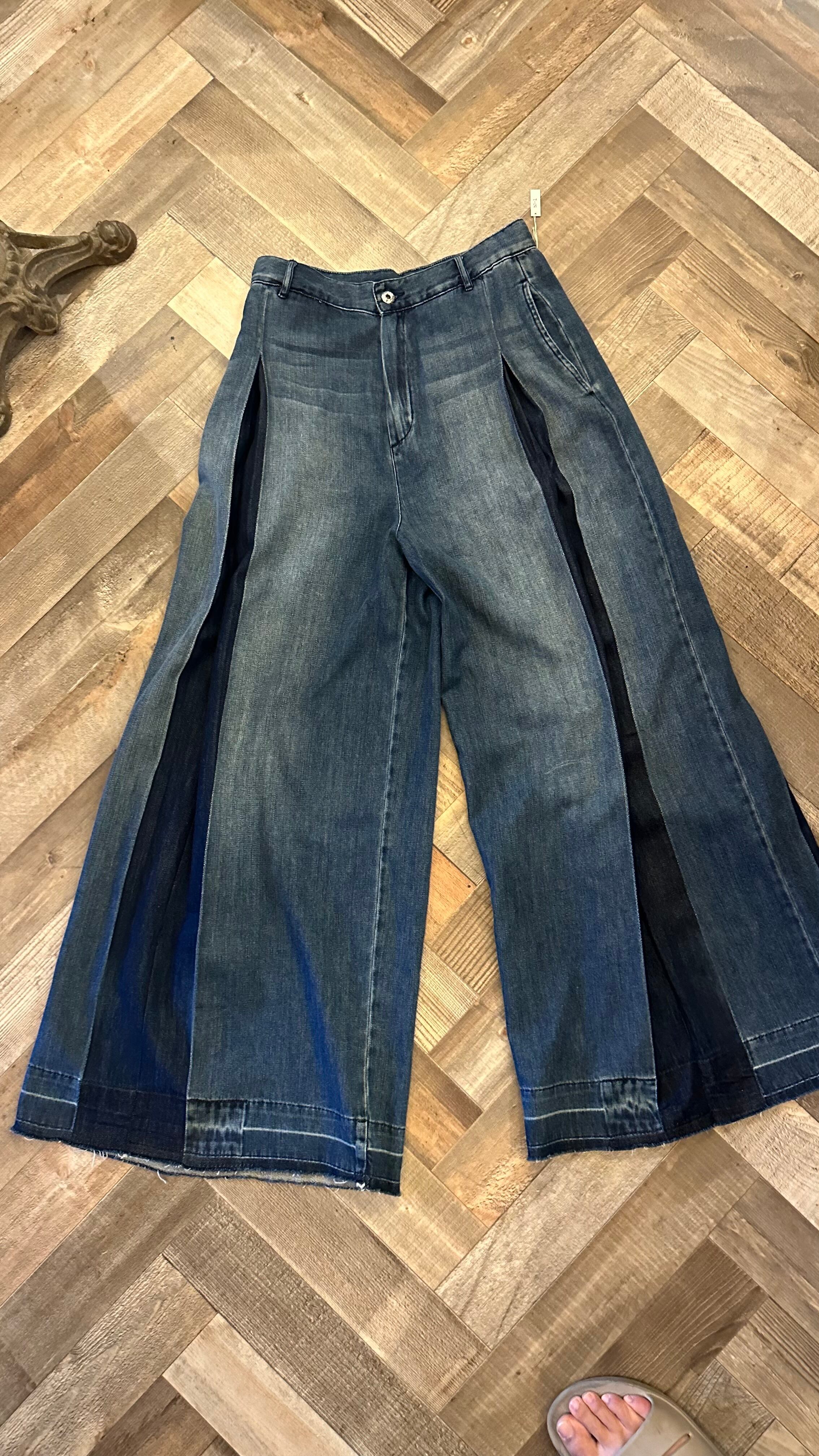 ◽️こんな再構築デニム見たことない!フロントとバックにタックが入ってて腰から段々と広がる最高のシルエットを演出ブーツを被せてもかっこいいですが個人的におすすめはコンバースの様なカジュアルなスニーカーをはいて裾を引きずり回してほしいです笑